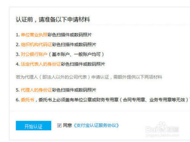 然后會提示你需要準備什么資料。如圖所示,需要營業(yè)執(zhí)照,組織機構(gòu)代碼,對公銀行賬戶,法人身份證等。如果不是法人開店還需要:代理人身份證,委托書。