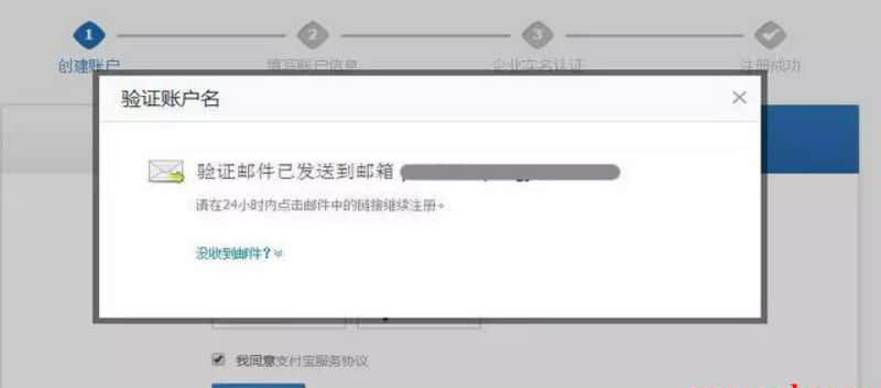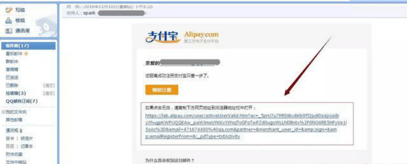 第五步:系統(tǒng)會將驗證郵件發(fā)送到之前填寫的郵箱。登陸該郵箱,在收件箱找到來自支付寶的郵件,并點擊網(wǎng)址鏈接,完成郵箱郵件驗證。