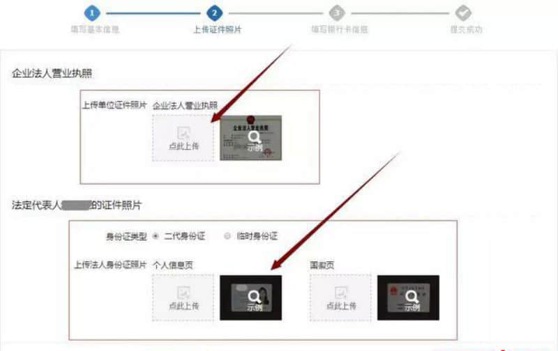 第四步:上傳證件照片,包括“企業(yè)法人他營業(yè)執(zhí)照”、“法定代表人的證件照片”,完成之后點擊“下一步”。