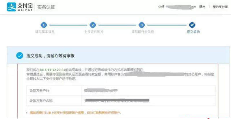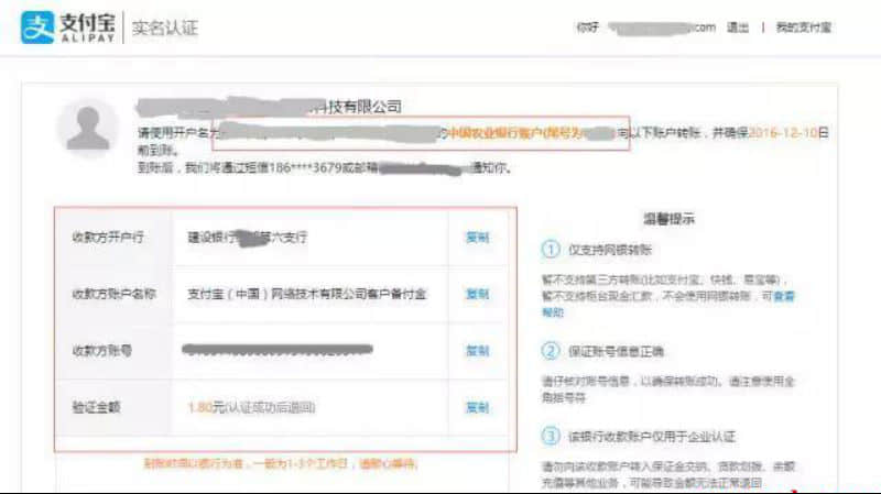 **步:2天內(nèi)收到系統(tǒng)“審核完成”的提示之后,登陸賬號,并根據(jù)上面的提示,用之前提交的對公銀行賬戶向指定的支付寶收款賬戶充值1.08元,完成驗證。